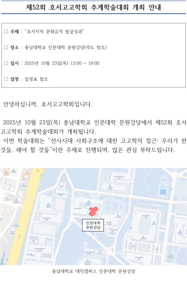 호서고고학회 제52회 정기학술대회를 아래와 같이 개최하오니,