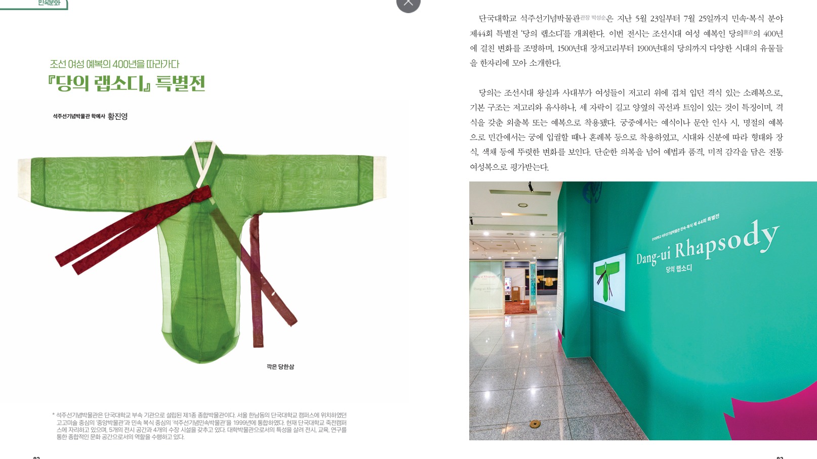 한국 전통복식 중 한국적인 아름다움과 독창적인 영역을 가지고 있는 당의의 시대변천에 따른 역사적인 작품들을 조명한 전시와 다양한 체험과 워크샵등의 연계프로그램 진행합니다